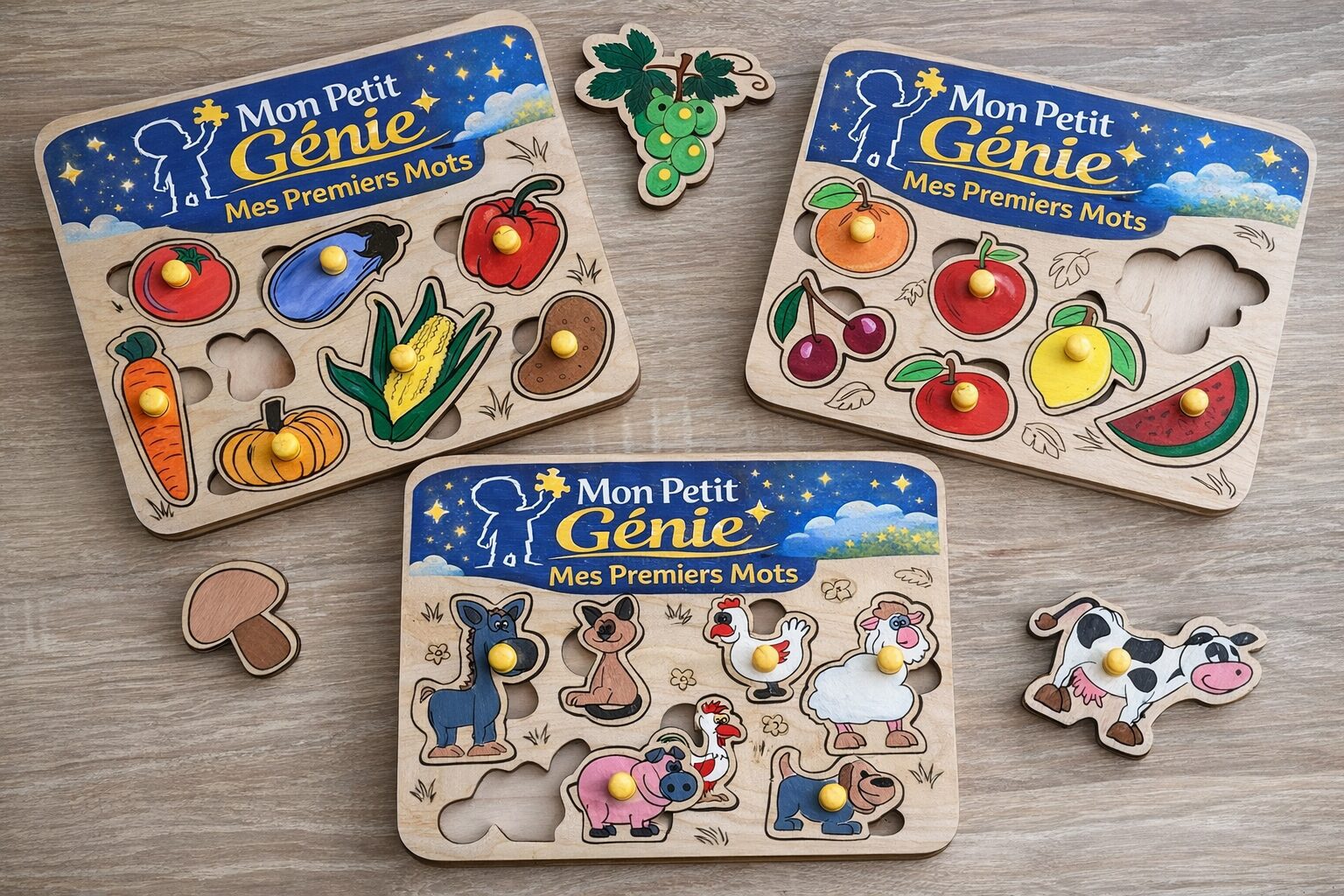 Offrez à vos enfants une expérience d’apprentissage ludique et colorée ! Avec nos puzzles en bois éducatifs, chaque pièce s’insère dans sa forme correspondante pour apprendre tout en s’amusant.